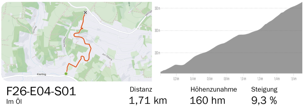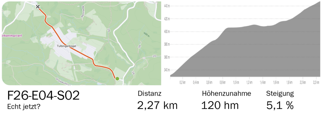 Weidlingau. Die längere Variante schwenkt westwärts nach Hainbuch und Richtung Mauerbach, diesmal lassen wir es uns aber nicht nehmen, den Klassiker des nördlichen Wienerwaldes schlechthin in die Wertung einzubauen: „Echt jetzt?“ steht für den „Tulbingerkogel-Revers“, die Challenge startet unmittelbar nach dem Rechtsabbiegen und endet vor dem Berghotel auf Höhe des linksseitigen Parkplatzes. Die Zahlen kennen wir alle in- und auswendig: 2,3 km und 120 Höhenmeter. Den Passauerhof und den Hirschengarten lassen wir 2 Mal links liegen und finden über Mauerbach wieder zur kürzeren Strecke zurück. Über die Siedlung am Wolfersberg kommen wir in Hütteldorf nach Wien herein. Wir folgen der Hüttelbergstraße nur kurz, sparen uns die Ampel und biegen in die Freyenthurmgasse ab, die uns in Richtung des dritten Wertungssegments führt.