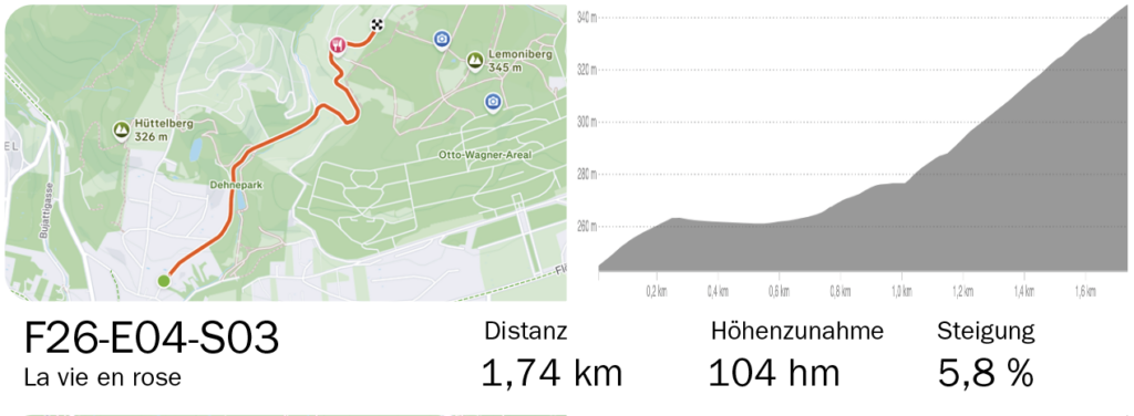 „La vie en rose“ ist nicht nur ein klassisches französisches Chanson, sondern auch ein Geheimtipp für die LiebhaberInnen städtischer Stiche. Namensgebend ist das Rosental, und 50 m nach dem Einbiegen in die namensgleiche Rosentalgasse geht es los. Zwischendurch schauen wir aufs Navi, um nicht falsch abzubiegen, beherzigen den Rechtsvorrang gemäß StVO und können uns am höchsten Punkt nach 1,7 km und 104 Höhenmetern wieder etwas ausrasten. Es folgt eine Tour durch die äußeren Bereiche von Ottakring und Hernals; wir geben uns den Anstieg auf den Schafberg und kommen nach Pötzleinsdorf. Dort ist der Spaß aber nicht zu Ende; über einen kaum bekannten kleinen Sattel führt uns die Route weiter nach Neuwaldegg, von dort aus über die Amundsenstraße nach Neustift am Walde.