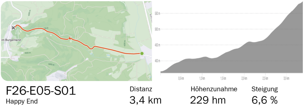 Nach einer längeren Rollstrecke durchs Rabnitztal folgt in einem kurzen Anstieg über den Pilgersdorfer Güterweg ein erster Vorgeschmack auf all das, was da noch kommen mag. Am Ortsende von Pilgersdorf ist dann auch der Beginn des ersten Wertungssegments verortet, dessen Motto, „Happy End“ eigentlich alles aussagt. Es endet nach 3,4 km und 229 Höhenmetern in Kogl, ca. 50 Meter vor der Kreuzung mit der Hauptstraße.