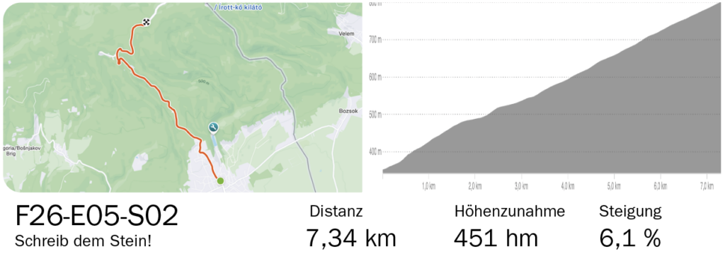 Nun folgt Stadtschlaining, die Burg und der Hauptplatz halten ganz gut für eine Kaffee- oder Snackpause her. Es folgt ein Abschnitt, der die Seele von 5 Frühlingsklassikern auf 20 km nicht besser zusammenfassen könnte: Rauhriegel, Rumpersdorf, Oberpodgorje, Parapatischberg und Althodis würde jeder vernünftige Mensch links liegen lassen, wir nehmen aber dem einzigartigen Straßenverlauf zuliebe alles mit, was wir kriegen können. Da wir aber auch dem sehr zackigen Abschnitt keinen Checkpoint verortet haben, lassen wir euch die Wahl einer flacheren Anfahrt nach Rechnitz, denn Berge kommen noch wie Sand am Meer. Rechnitz bietet an der B56 noch eine Tankstelle oder ein Eisgeschäft zum Nachladen, aber es führt sprichwörtlich kein Weg an dem vorbei, was jetzt kommt. An der Bundesstraße etwa 30 m hinter der Kirche startet „Schreib dem Stein!“, das zweite Wertungssegment. Über 7,3 km und 451 Höhenmeter erreichen wir das Dach des Burgenlandes, den Geschriebenstein, und haben am Parkplatz das forderndste Segment des FK 2026 hinter uns gebracht.