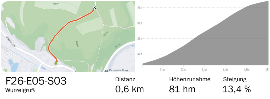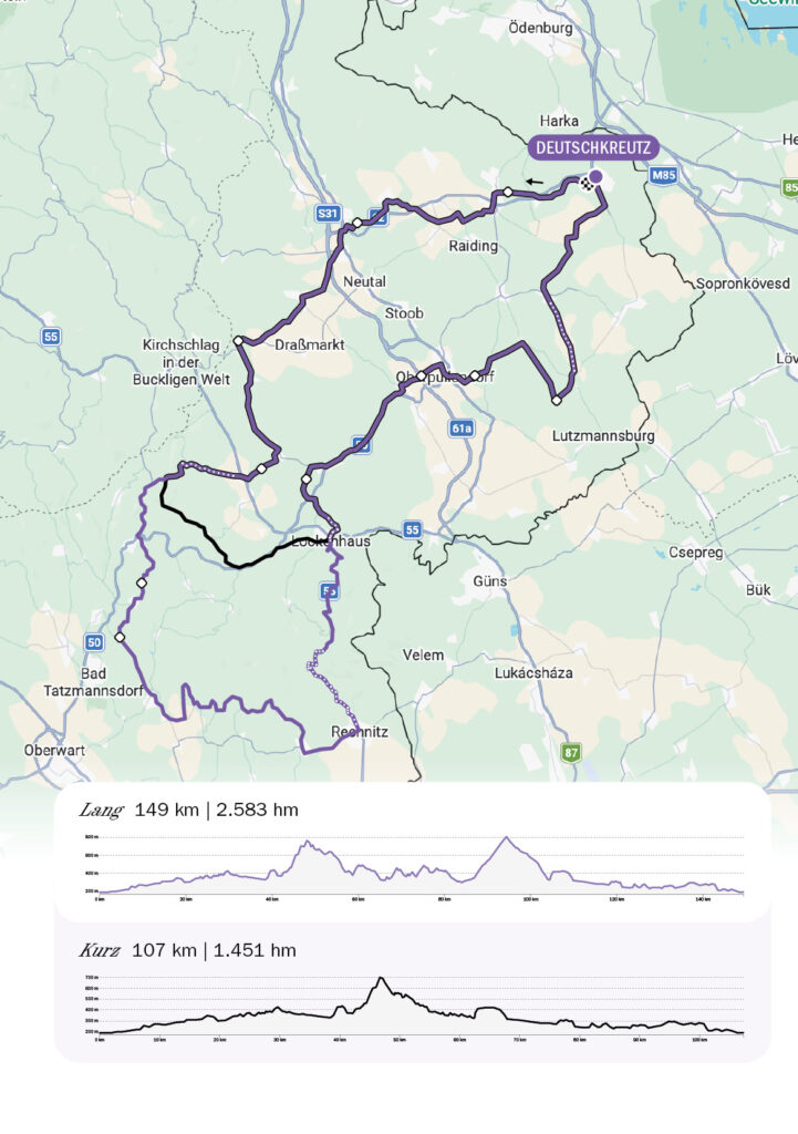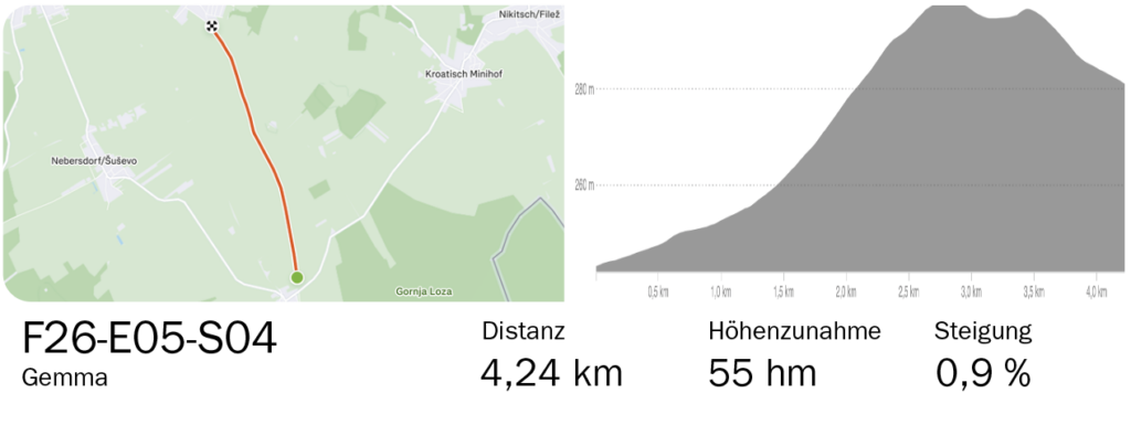Die folgende Abfahrt nach Lockenhaus ist ein Traum; traumhaft sind auch die Verpflegungsmöglichkeiten am Hauptplatz, beim Einbiegen auf den Güterweg Schüttberg am Forsthaus ist der Traum aber schon wieder vorbei. Der „Wurzelgruß“ startet direkt nach dem Abbiegen und endet im Wald am Ende einer Dreieckskreuzung mit einem rechtsseitigen Forstweg. Wir lassen die Zahlen des dritten Wertungssegments für sich sprechen: 600 m Länge und 81 m Höhendifferenz. Über Hochstraß erreichen wir Piringsdorf (Wasserstelle, Tankstelle!), Steinberg und die Bezirkshauptstadt Oberpullendorf (Cafés!). Zwei Hügel weiter nach Osten folgen Langental und Šuševo/Nebersdorf, wo wir auf dem Güterweg weit nach Süden ausholen, um noch die Kurve zum vierten und letzten Wertungssegment zu kratzen: „Gemma“ startet in Geristof/Kroatisch Geresdorf unmittelbar nach dem Einbiegen auf den Güterweg und führt uns temporeich über 4,2 km und 55 Höhenmeter an den Ortseingang von Mali Boristof/Kleinwarasdorf, wo dann alles wie ein Schleier von uns abfällt. Bergab durch den Kreutzer Wald und vorbei an Windrädern und Solarfarmen erreichen wir bald wieder unseren Ausgangspunkt in Deutschkreutz.