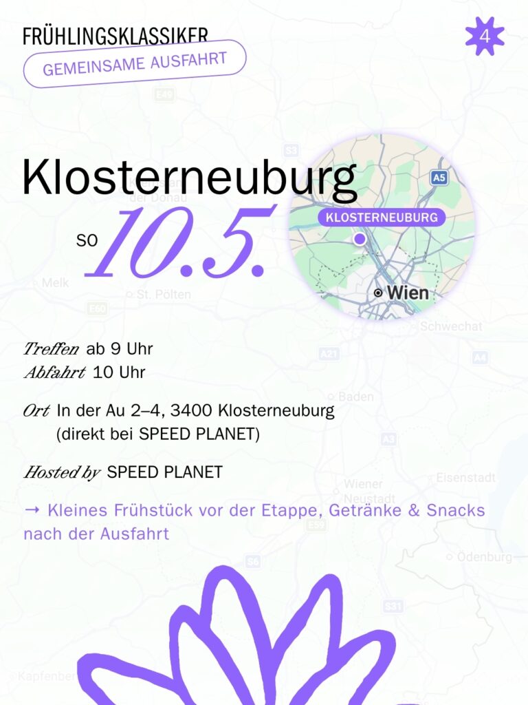 Treffpunkt ist direkt beim Shop in Klosterneuburg, wo man sich im Rahmen eines kleinen Frühstücks noch über die bevorstehende Etappe austauschen kann. Aus diesem Grund bitten wir euch um Anmeldung zum Event (via Facebook oder Strava) ob ihr teilnehmen werdet, damit wir die Mengen fürs Frühstück einschätzen können!!