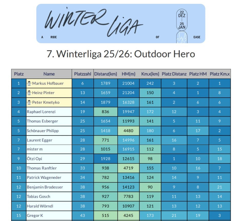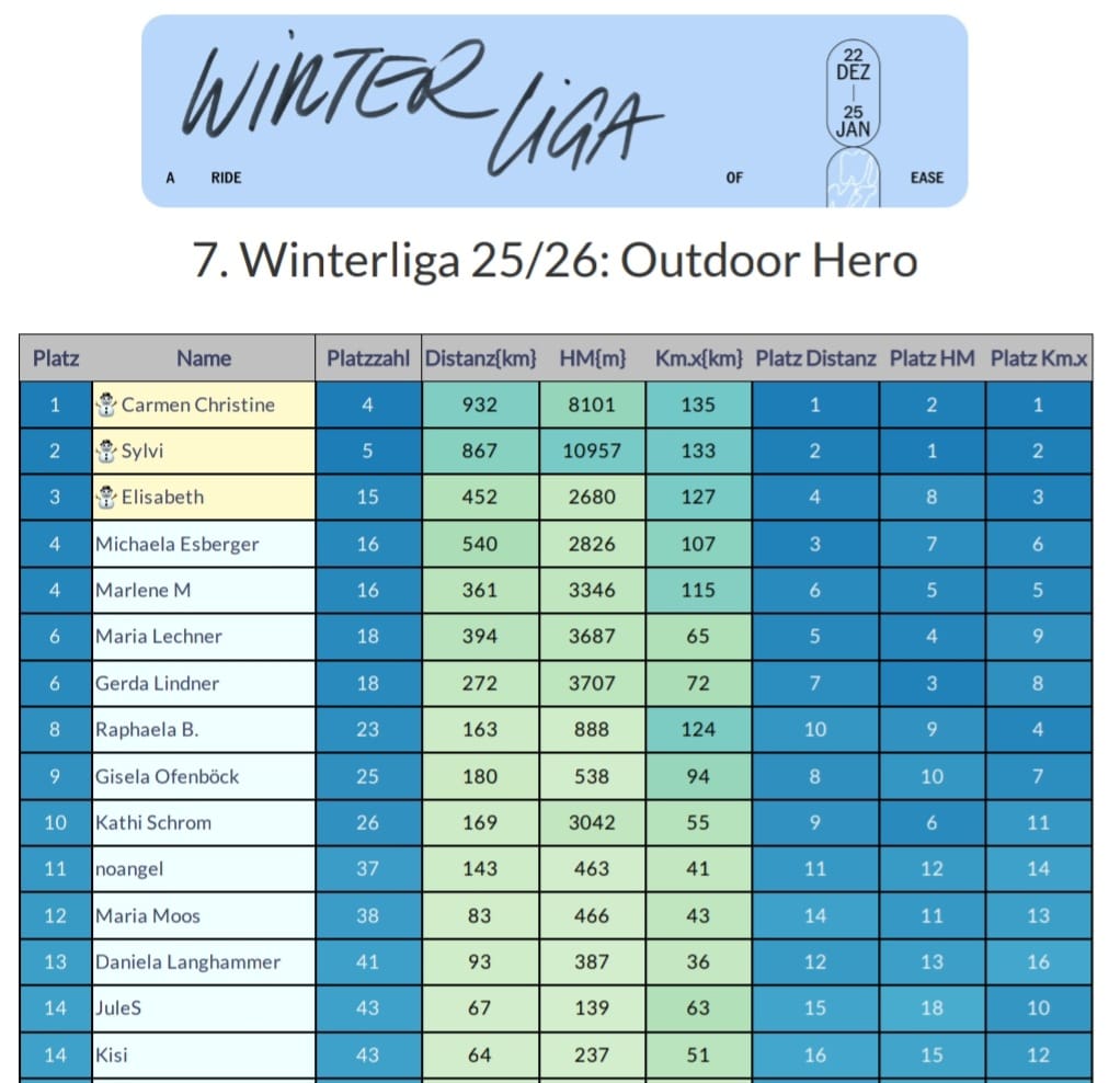 In der Outdoor Hero Wertung ist bei den Frauen aber noch alles offen. Carmen Olszewski führt knapp vor Sylvi, für den dritten Platz in der Endabrechnung könnten aber noch 5 Frauen in Frage kommen.