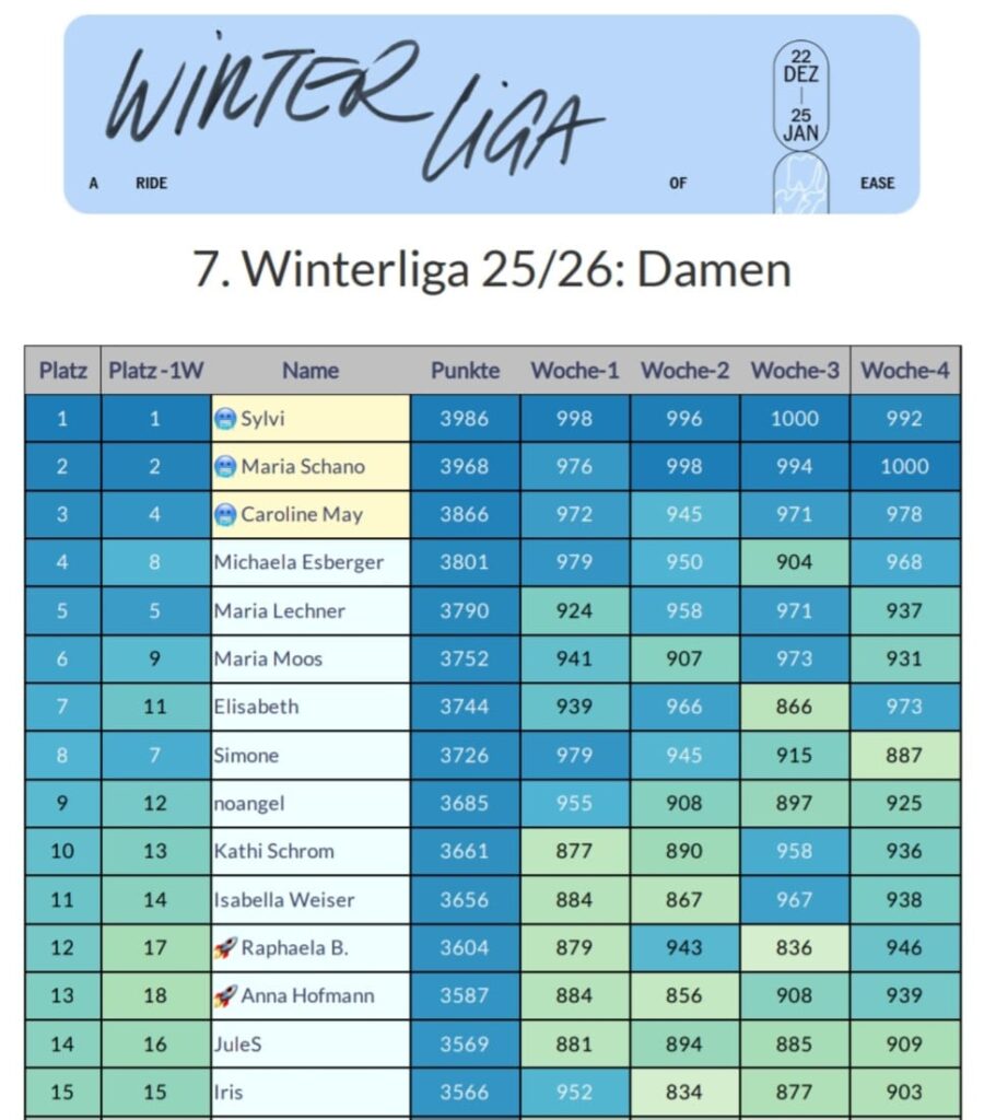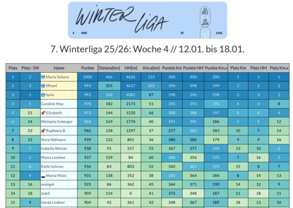 In der Wochenwertung bei den Frauen werden fast schon traditionell die Plätze getauscht. Diese Woche hat sich Maria Schano den Sieg vor Sabine Pearl geholt. Ausschlaggebend waren am Ende 9! Höhenmeter und 20 km