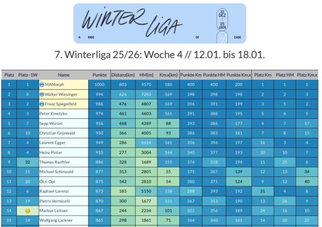 Damit es auch bis zum Schluß spannend bleibt, werden wir wie immer ab Freitag die Ergebnislisten „einfrieren“ (wie passend bei dem Wetter ;-)). Die SiegerInnen werden dann am Montag veröffentlicht.