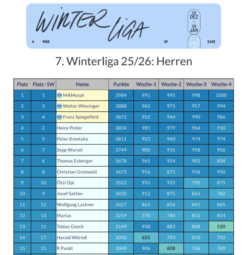 . Die letzte Winterliga Woche hat begonnen und schon am vergangenen Wochenende konnten wir sehen, dass ihr euch von Minus-Graden, Eis und Schnee nicht abhalten lasst. Betreibt es aber trotzdem mit Maß und Ziel, wie immer gehts ja nur um die berühmte goldene Ananas ![]()