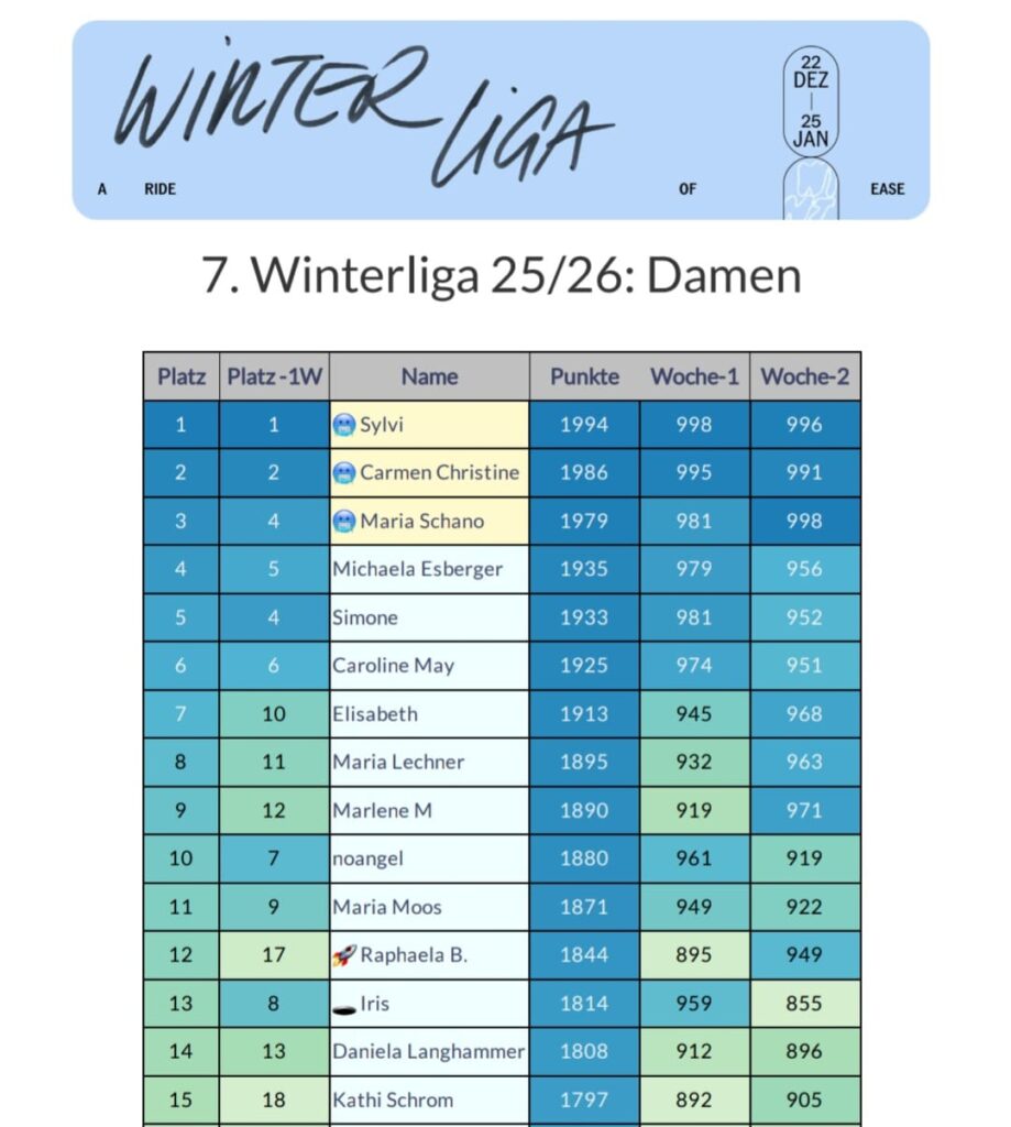 In der Zwischenwertung haben sie die Ränge getauscht, liegen aber alle innerhalb von 15 Punkten – Sylvi vor Carmen Olszewski und Maria Schano.