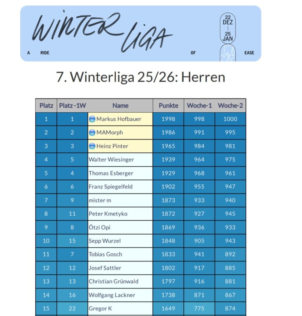Vorjahrssieger Markus Hofbauer gewinnt alle 3 Einzelwertungen und die zweite Wertungswoche mit 1000 Punkten vor @MAMorph und Heinz Pinter.