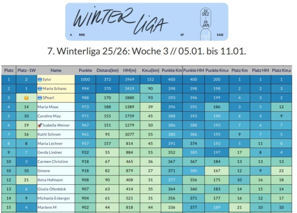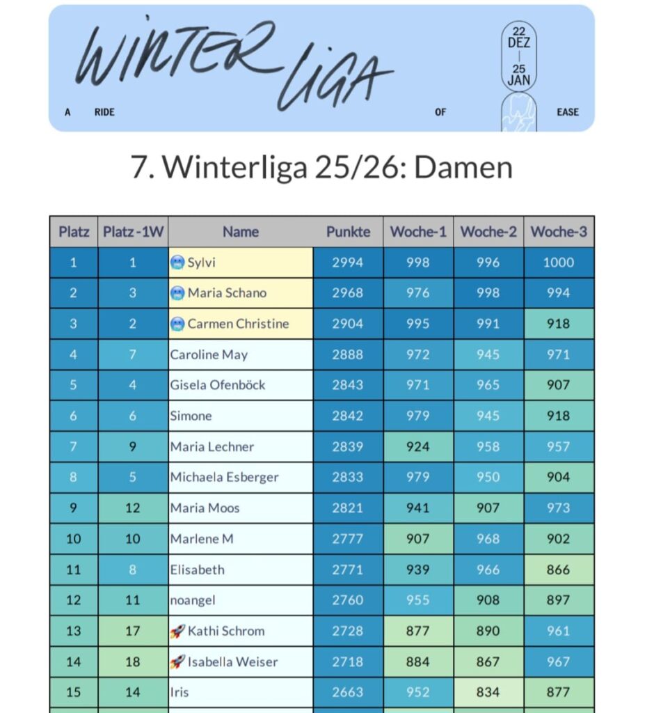 In der Gesamtwertung nach 3 Wochen Winterliga hat Sylvi nun ihren Vorsprung etwas ausgebaut und liegt mit 2994 Punkten vor Maria Schano (2968 Punkten) und Carmen Olszewski (2904 Punkten) in Führung.