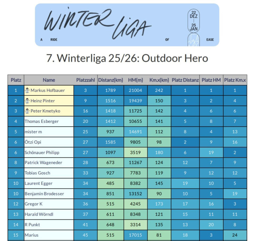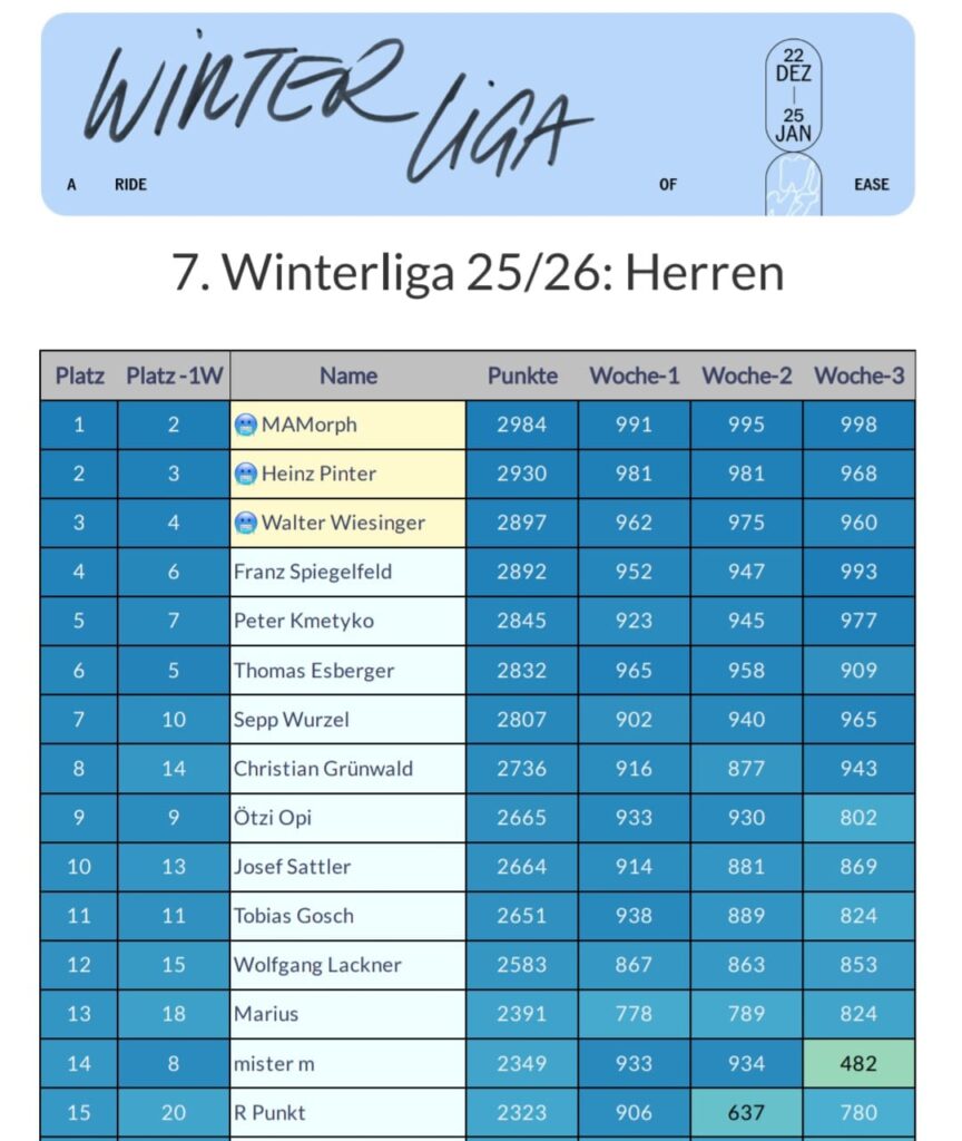 Bei den Männern hat zum ersten Mal in der Winterliga Geschichte MAMorph die Führung übernommen und gleichzeitig sogar einen schönen Vorsprung (54 Punkte) auf Heinz Pinter und Walter Wiesinger herausgefahren.