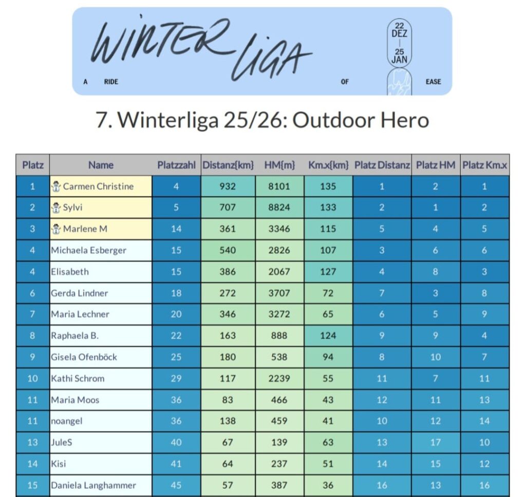 In der Outdoor Hero Wertung der Frauen matchen sich Carmen Olszewski und Sylvi um den Sieg. Aktuell sind sie nur durch 1 Platzziffer getrennt und mit einer langen Ausfahrt von Sylvi könnte sich das Blatt wenden. Auf Platz 3 liegt Marlene M, die aber ebenso nur 1 Platzziffer vor Michaela Esberger und Elisabeth liegt.