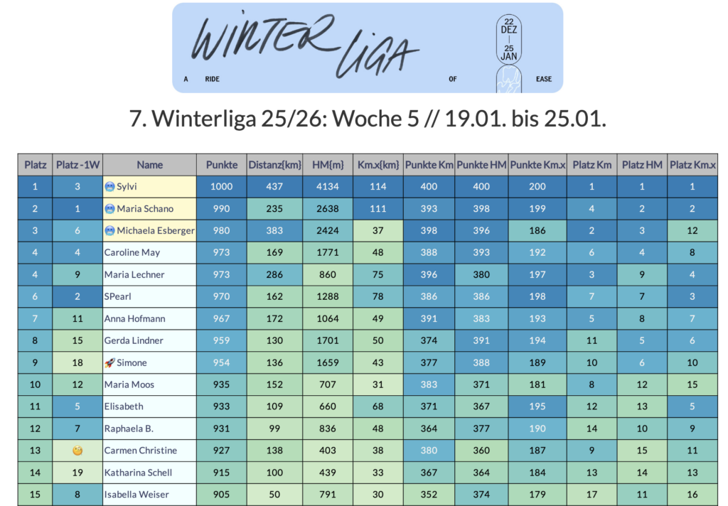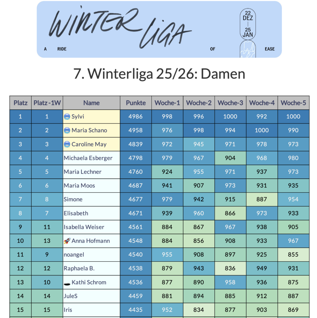 Bei den Frauen hat sich Sylvi nicht mehr von der Spitze verdrängen lassen und mit einem Wochensieg den Gesamtsieg mit 4986 Punkten geholt. Auf Platz 2 landete Maria Schano, die bis zum Ende knapp dran war. Dritte wurde mit regelmässig konstanten Wochenleistungen Caroline May.