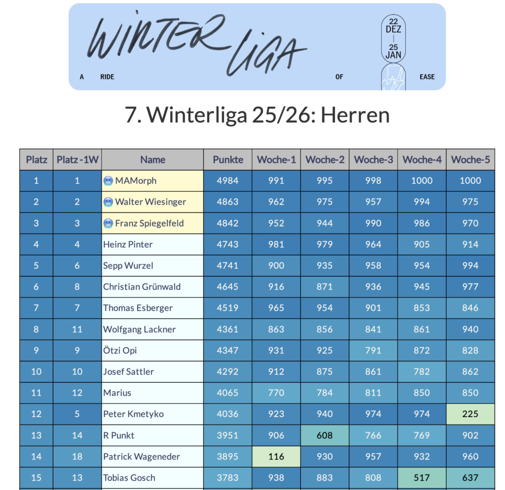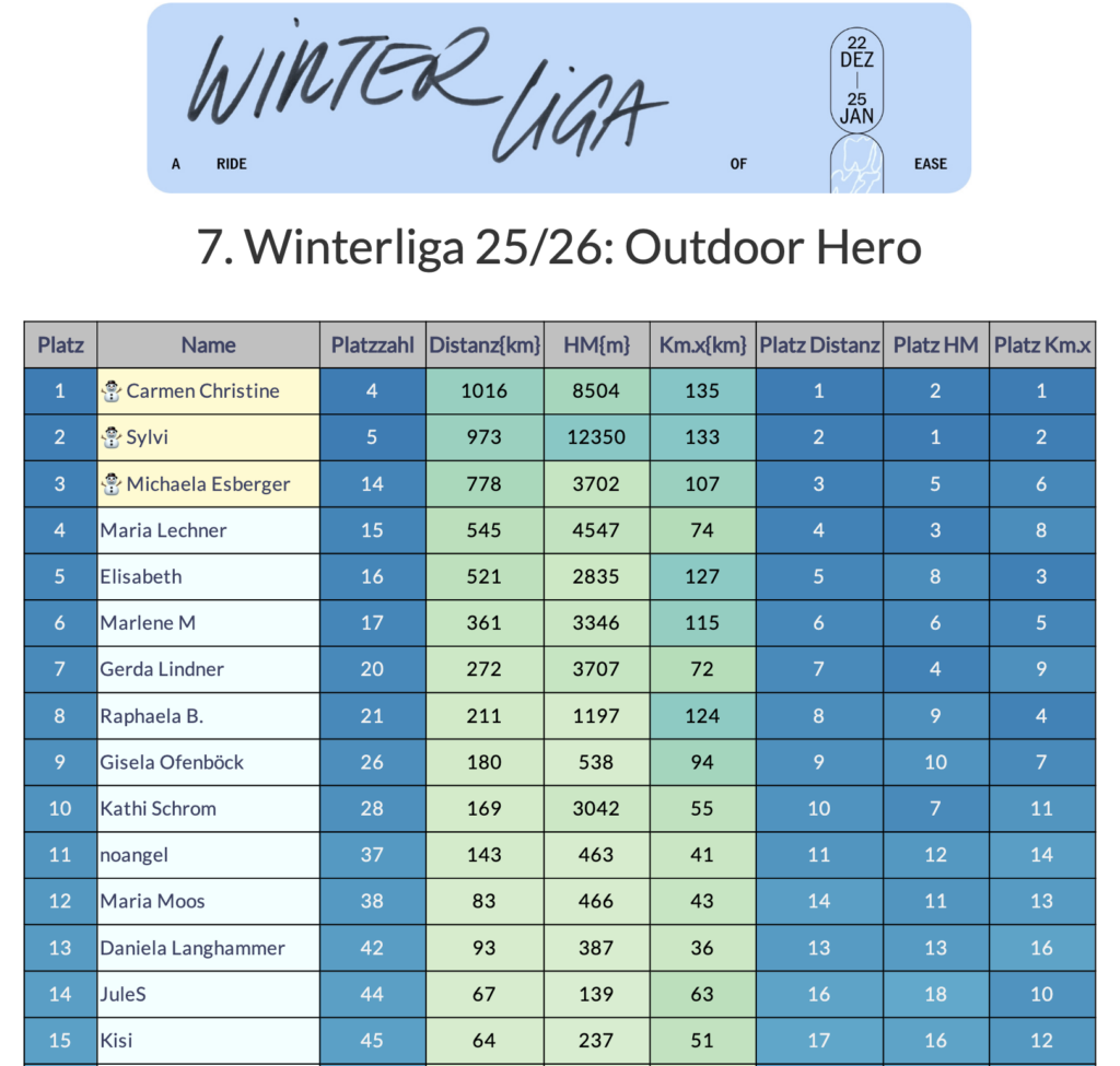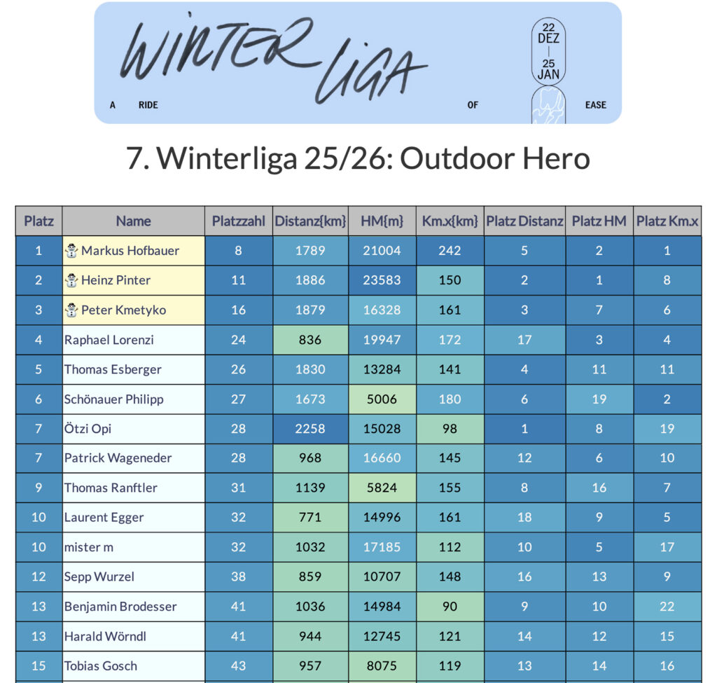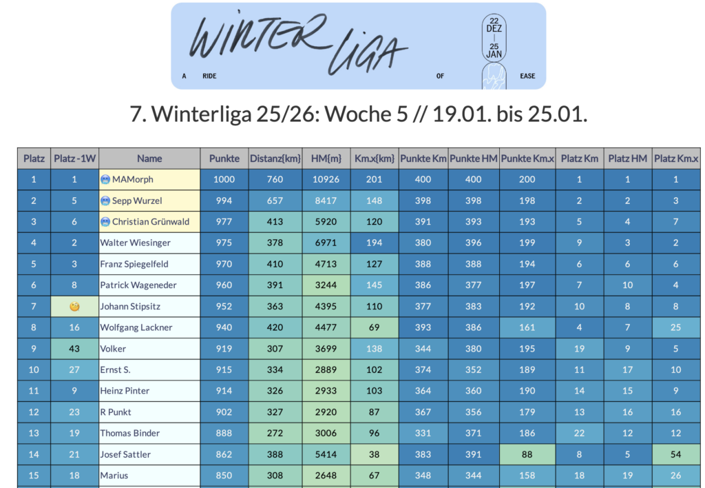 Fünf Wochen Winterliga liegen nun hinter uns. Von mehr als 30 Grad in der Sonne bis kräftigen Minusgraden bei Eis und Schnee war alles dabei. Aber egal wo und wieviel jeder gefahren ist, ihr konntet so euch, aber auch andere motivieren und etwas für eure Kondition tun.